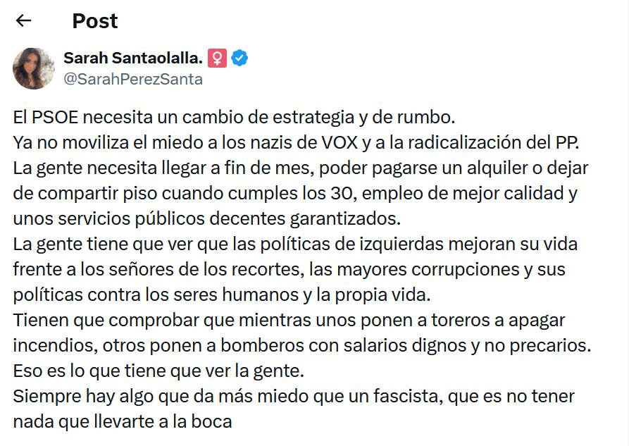 Con un posteo en la red social X vemos cómo salta por la borda y abandona el sanchismo: si hasta ayer todo iba sobre ruedas, fuera sanchismo o socialismo, la más joven tertuliana del equipo de opinión sincronizada ha dicho basta así: