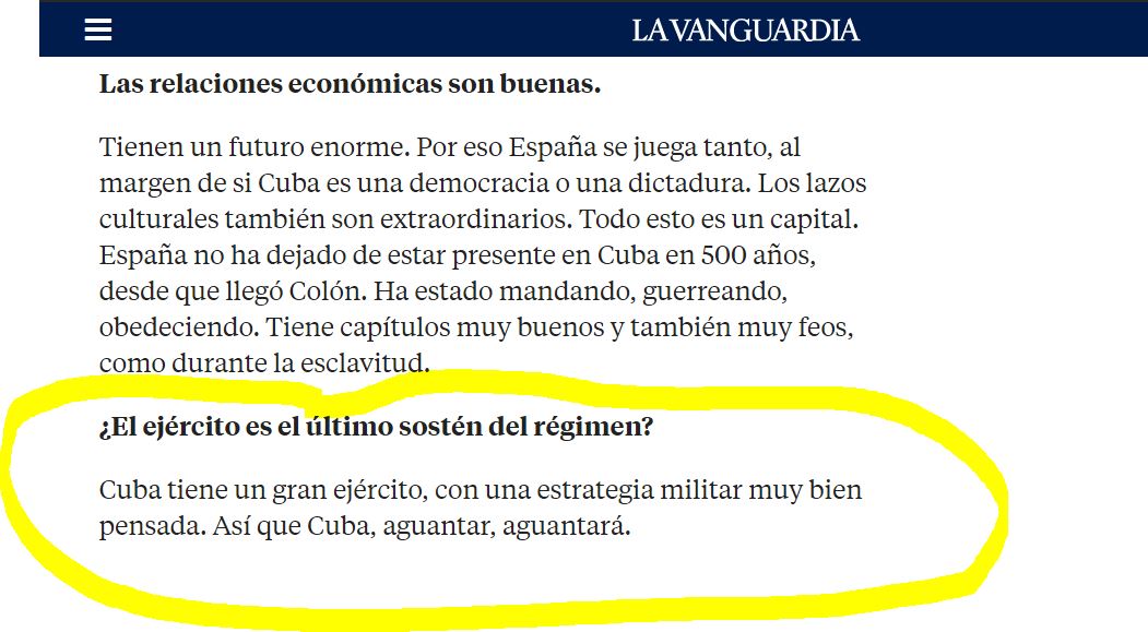 Y como todo "buen comunista" sabe que solo por la fuerza dejan los comunistas el poder, y señala al ejército como garante de la dictadura contra el pueblo cubano.