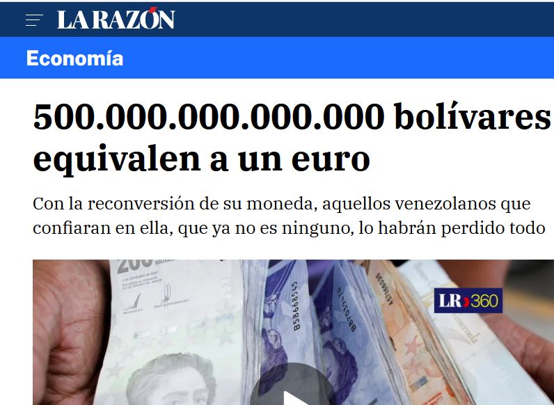 Dinero para asar una vaca, los dos euros de salario mínimo son un 5 seguidos de 14 ceros y multiplicado por 2. Porque un euro en venezuela es 500.000.000.000.000 bolívares. Sí quinientos mil millones de bolívares valen por un euro. He visto la foto, esta.