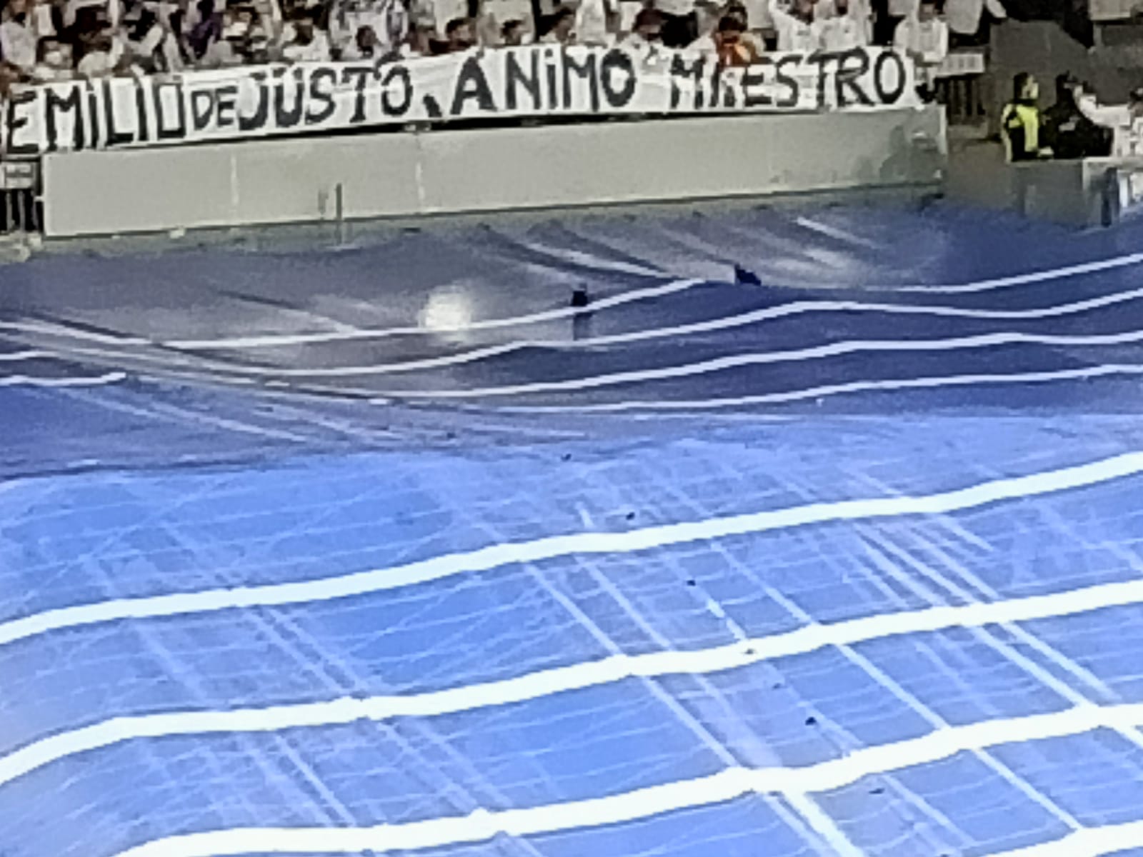 Ánimo para Emilio de Justo... desde el Bernabéu, en el partido Real Madrid contra el Chelsea esta pancarta:
