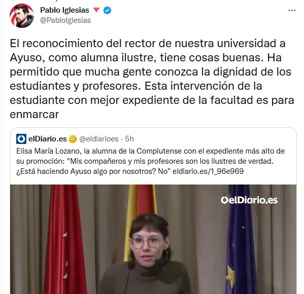 No fueron dos, fueron tres mujeres. Cayetana Álvarez fue la primera; en su discurso en el Parlamento, Álvarez de Toledo puso a Pablo Iglesias el envoltorio de "terrorista" cuando le afeó enorgullercerse de esa faceta "profesional" de su padreTagaldabas escribió: ↑Vie Ene 13, 2023 10:12 amDos mujeres echaron a Pablo Iglesias de la política, Monasterio y Ayuso.