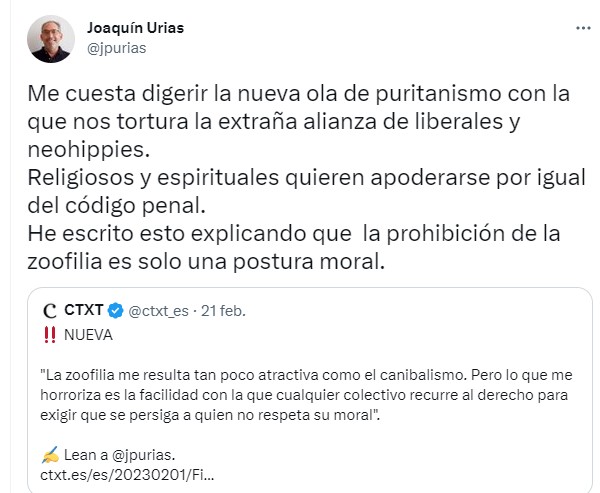 Os subo la culminación, la última de este profesor, que parece disfrutar primero con la situación aberrante de mujeres y hombres recurriendo a las bestias para obtener placer sexual, y el segundo disfrute del profesor, es desde sus conocimientos de derecho burlarse del enjambre de usuarios que a veces acuden a un solo tuit: