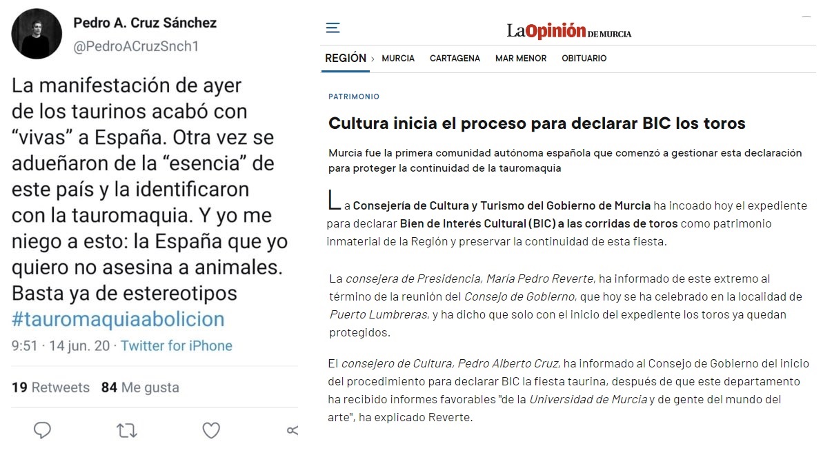 El caso del consejero que promovió la tauromaquia como Bien de Interés Cultural y luego se convirtió en un antitaurino brutal. Su nombre es Pedro Alberto Cruz. Sucedió en Murcia con unos pocos años de diferencia: un viaje del PP a Podemos