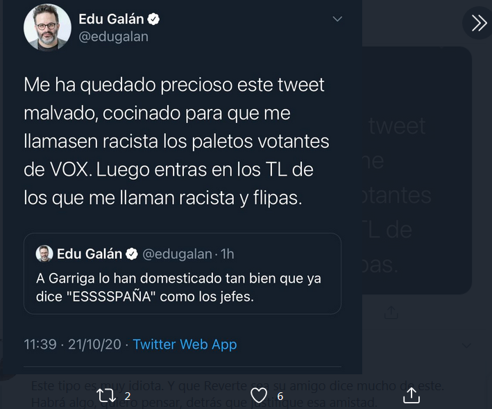 Un nuevo tuitero para esta lista de los más impresentables. Este tuitero además de antitaurino intolerante habitual, ha mostrado un corte racista que no podemos dejar de denunciar. Este elemento además, es cabeza pensante en una revista de humor cuyo nombre no voy a mencionar, pero que quería aprovecharse del patrimonio como persona famosa del diestro Ortega Gano, quería apropiarse de ello en beneficio propio. A esto la justicia colocó a Edu Galán en su sitio. Este Edu Galan ha dejado este tuit de abajo y la respuesta/correción en el tuit de arriba. Digámoslo claro a este Edu Galan, llamar moreno a un negro sigue siendo racismo.