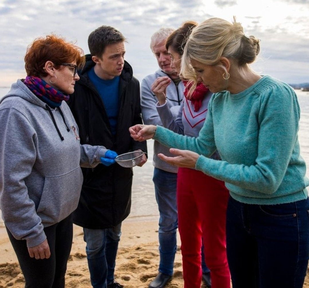 En la foto Errejón y Yolanda Díaz y tres personas más encuentran un pellet de medio centímetro.