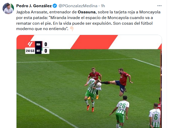 La tarjeta roja a Moncayola por esta entrada sobre Miranda es clara, evidente e indiscutible. No se mide la intencionalidad, sino el peligro físico de los futbolistas. Y el peligro es real. Si lanzas una patada de kárate el riesgo que corres es de roja.