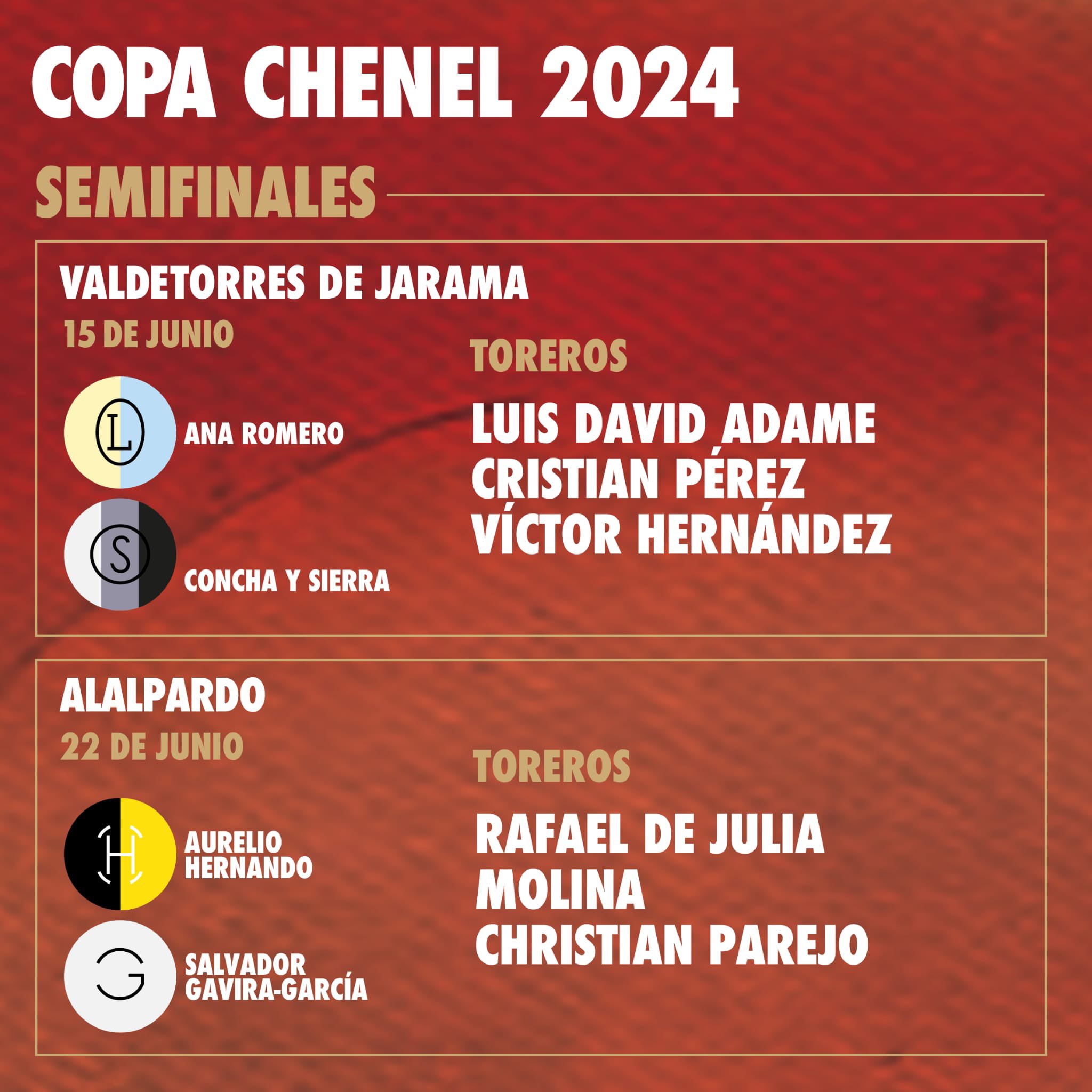 Estos son los seis toreros que disputarán los tres puestos de la final de la copa Chenel. Cristian Pérez, Luis David Adame y Víctor Hernández como primeros; y Christian Parejo, Rafael de Julia y Molina como segundos clasificados. Algente, San Martín de Valdeiglesias y Valdemoro han sido las plazas donde estos toreros ganaron su pase a "semis". Y Valdetorres del Jarama y Alalpardo serán las plazas de toros donde competirán por la final.