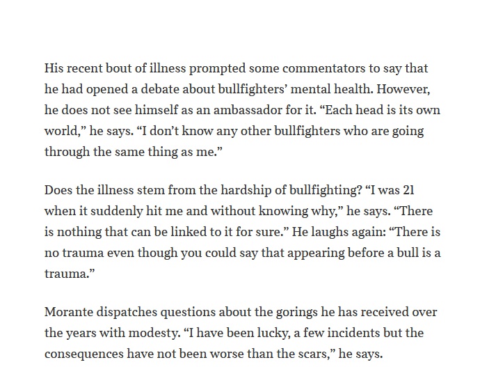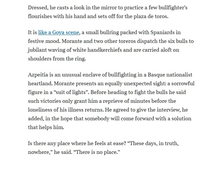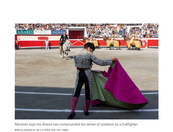 Azpeitia es un enclave inusual de tauromaquia en un bastión nacionalista vasco. Morante presenta una visión igualmente inesperada: una figura triste en un "traje de luces". Antes de dirigirse a lidiar con los toros, dijo que tales victorias solo le conceden un respiro de minutos antes de que regrese la soledad de su enfermedad. Aceptó dar la entrevista, añadió, con la esperanza de que alguien se presente con una solución que le ayude.