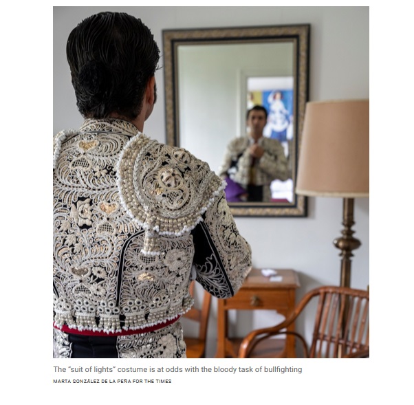 El traje, con su ropa interior de algodón y delicadas cintas, está en desacuerdo con la sangrienta tarea que le espera a quien lo lleva. Morante ya no se entrega a elaborados rituales previos a la corrida que algunos toreros esperan que traigan buena suerte. Pero tiene fe. "Los toreros no son grandes para ir a misa. Cada uno tiene su fe personal", dice. "Creo que ayuda a seguir adelante cuando uno siente que no puede, implorar al Altísimo para que te ayude, y él lo hace."