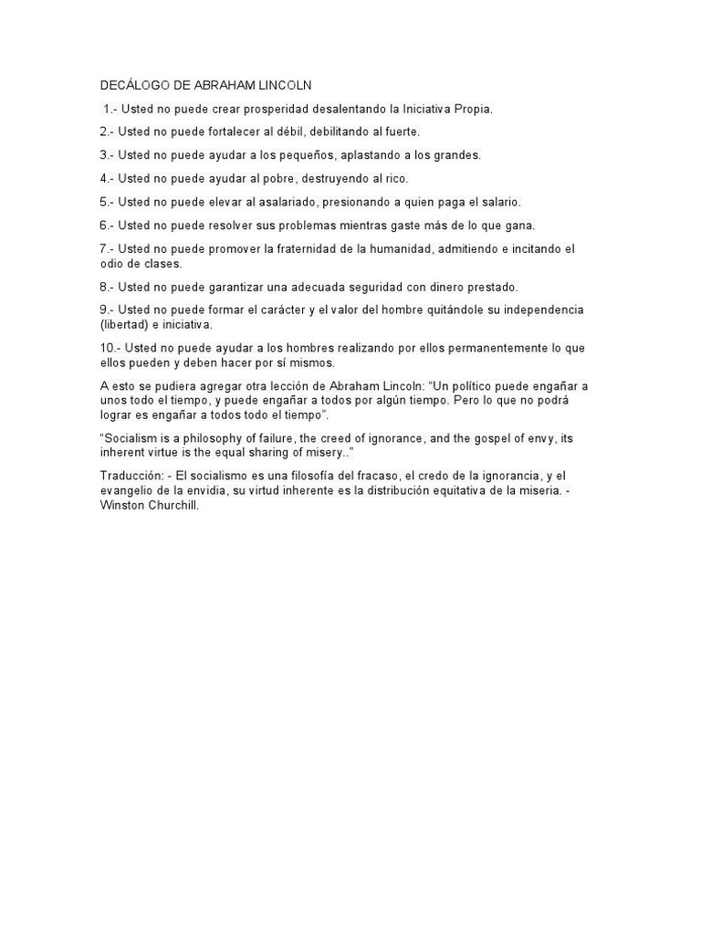 Esto también es falso. Se le atribuye pero no solo no hay nada parecido en sus escritos; es que algunas ideas de este texto son muy posteriores a la muerte de Abraham Lincoln. Si decimos que esto lo escribió Francisco Franco puede igualmente "colar" como verdadero en ciertos grupos hoy. Y dentro de 15 años traducido a otro idioma, podría "colar" a fondo como texto de Franco. Ahí va:
