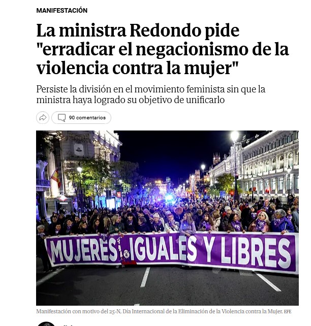 Aquí tenéis otra fotografía "engañosa". Estamos ante un acontecimiento de primer orden en la "narrativa" del nuevo feminismo; estamos en el día contra la violencia contra las mujeres... ¿y? No solo la sociedad, hasta las mujeres pasan de "este relato". El feminismo actual es un fraude.
