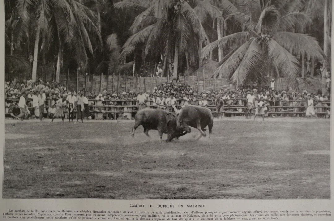 Los combates de búfalos constituyen en Malasia una verdadera distracción nacional: son el pretexto de considerables apuestas; es además por eso que el gobierno británico, alarmado por los estragos causados por el juego en la población, se esfuerza por prohibirlos. Sin embargo, ciertos estados que han permanecido más o menos independientes conservan esta tradición, como el sultanato de Kelantan, donde se tomó esta fotografía. Los cuernos de los búfalos están fuertemente afilados, y, sin embargo, los combates son generalmente menos sangrientos de lo que se podría pensar; por instinto, el animal que está en desventaja se apresura a huir tan pronto como percibe su debilidad.