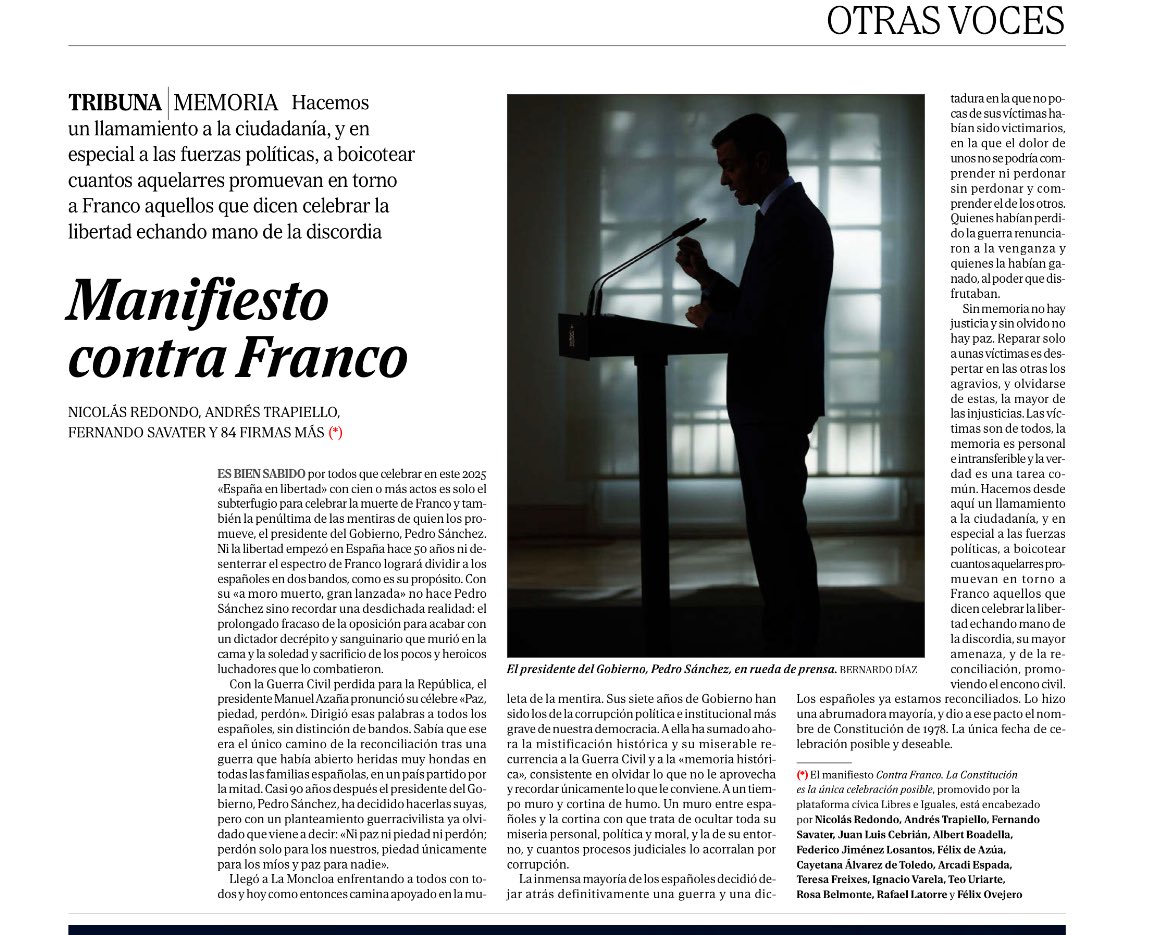 (☞) El manifiesto Contra Franco. La Constitución es la única celebración posible, promovido por la plataforma cívica Libres e Iguales, está encabezado por Nicolás Redondo, Andrés Trapiello, Fernando Savater, Juan Luis Cebrián, Albert Boadella, Federico Jiménez Losantos, Félix de Azúa, Cayetana Álvarez de Toledo, Arcadi Espada, Teresa Freixes, Ignacio Varela, Teo Uriarte, Rosa Belmonte, Rafael Latorre y Félix Ovejero.