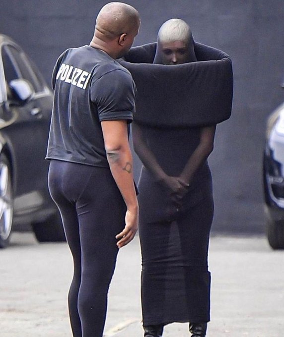 Me cuentan que esto fue en París; el kanye west se presentó con traje de apicultor, y llevó a su mujer Bianca Censori de "gala" así:
