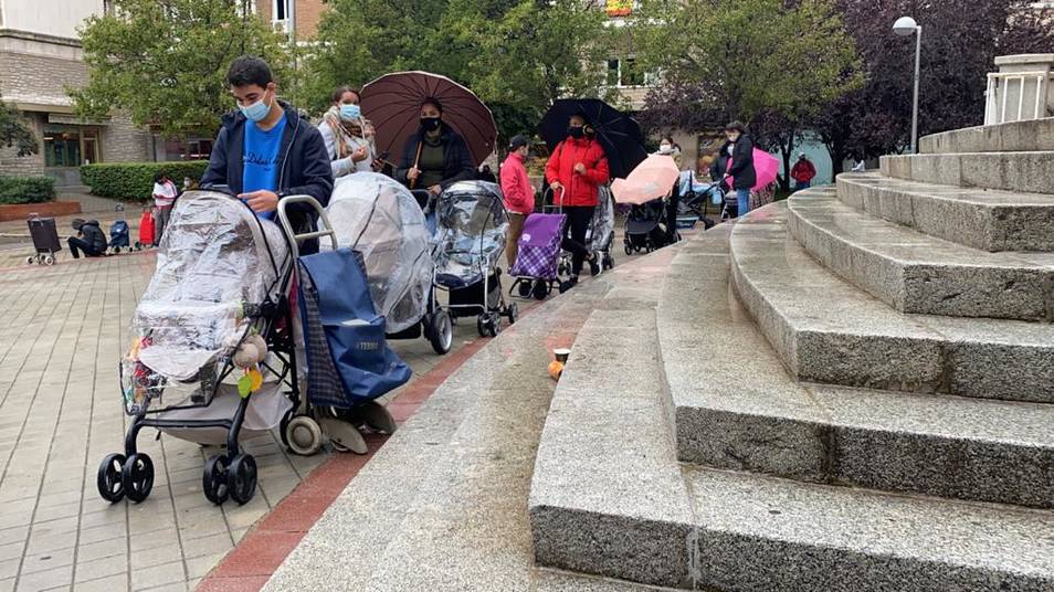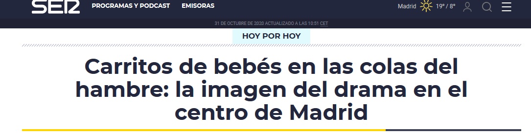 Las colas del hambre siguen en Madrid, y eso que Madrid mantiene la actividad al máximo posible dentro de las limitaciones que impone la lucha contra la pandemia. Hoy es la comunidad con mejores resultados en España, excepto las islas. Sí, y en Madrid muchos carritos de bebés en las colas del hambre.