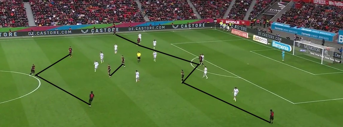¿Se puede resumir el fútbol de un entrenador en unos pocos vídeos? Sí y no. Un entrenador debe tener fútbol para su plantilla; pero un fútbol adaptable a cada plantilla. Observemos esta jugada con el Bayer Leverkusen.