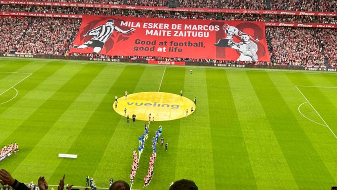 El vascómetro es esto: se despide del fútbol el futbolista de Marcos después de unos cuantos años. Todo el mundo sabe que de Marcos no habla eusquera ni inglés. Pues el hacen un tifo en inglés y en eusquera: esto es vascómetro.