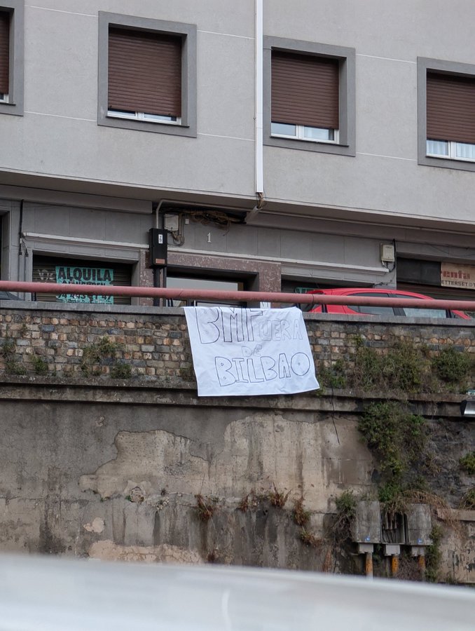 La afición de Bilbao no está muy feliz con la empresa BMF y lo deja con pancartas escrito por la ciudad de la ría.