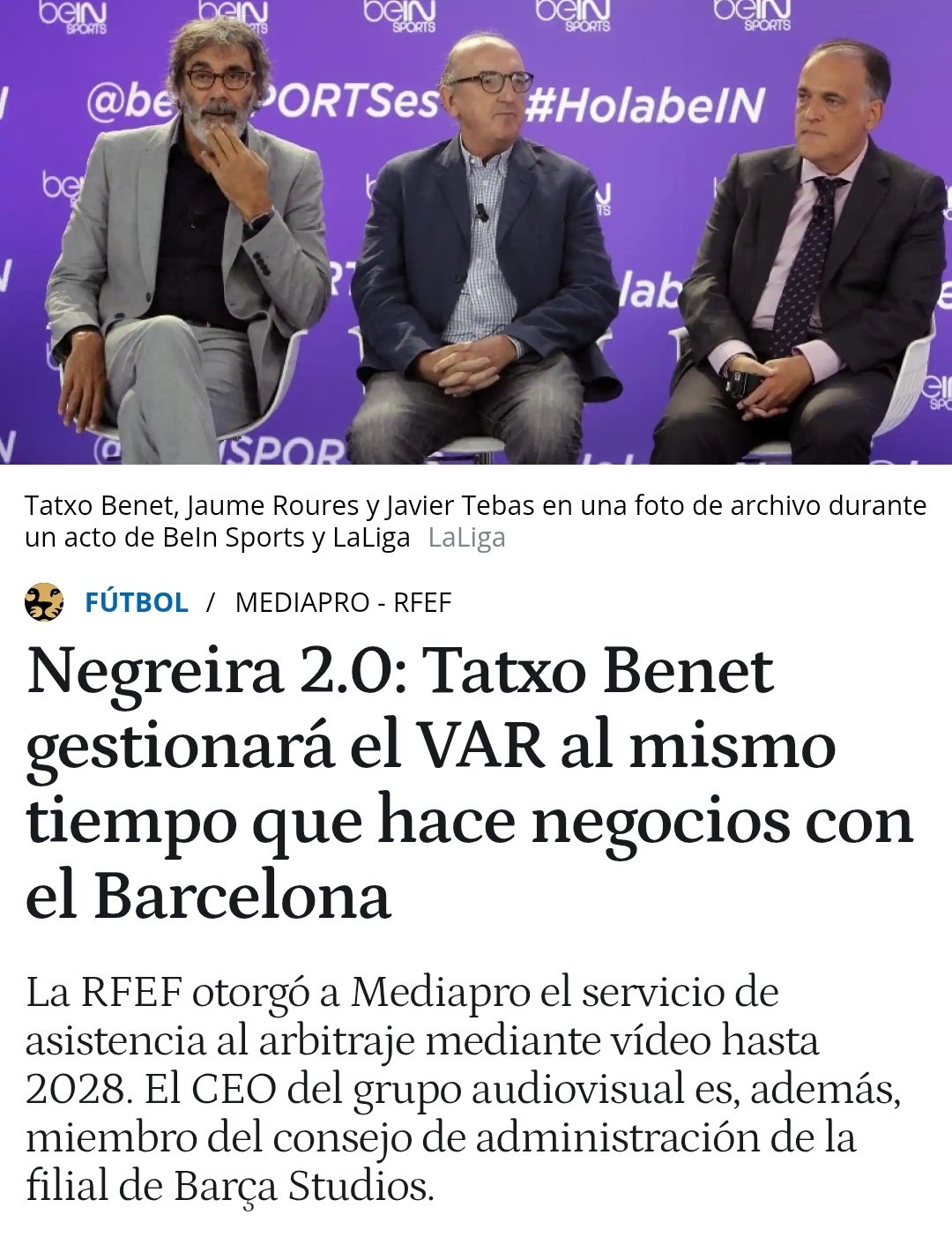 La Liga es un fraude, abierto, descarado y desvergonzado. ¿Sabes quién es el responsable del VAR? El responsable del VAR es un tipo que hace negocios con el FC Barcelona; sin taparse, sin vergüenza y con publicidad. La Liga es un fraude: