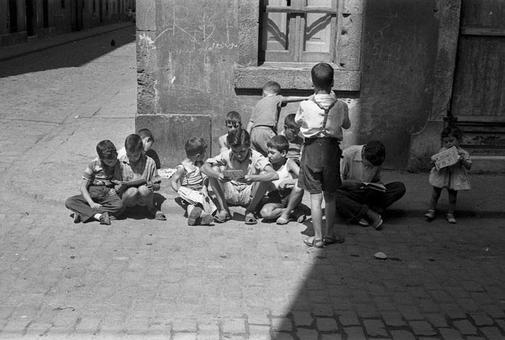 Mercado de cromos entre la chiquillería, Leopoldo Pomés