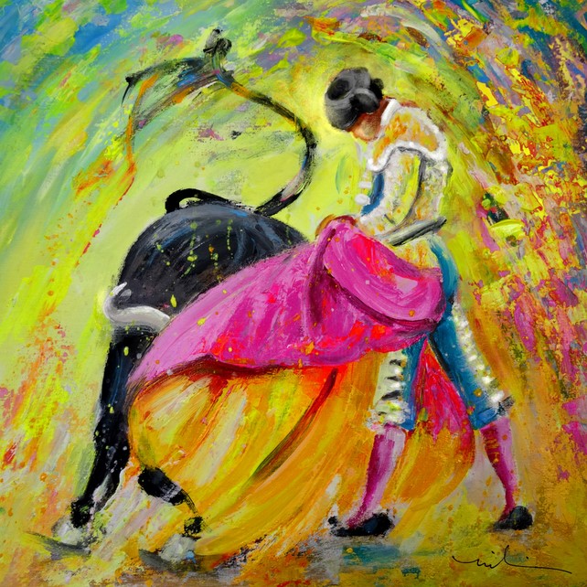 En palabras de la propia artista, su pintura es «un reflejo de su vida», una celebración apasionada e incontrolable del mundo, muy en sintonía con su personalidad: amante del caos ordenado, de bailar sobre volcanes, del desierto, del océano… y, por supuesto, de las virutas de chocolate. Miki de Goodaboom navega contracorriente de la actualidad pintando corridas de toros.