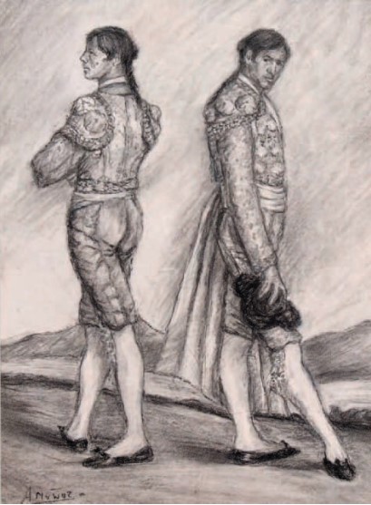 En 1933 pinta Toros (Tauromaquia), hoy conservada en el Museo Nacional Centro de Arte Reina Sofía. El cuadro no busca el realismo fotográfico; busca el ritmo: manchas, tensiones, una atmósfera donde el toro aparece como energía más que como anatomía. Ese enfoque conecta con la experiencia de la Escuela de Vallecas: simplificar para llegar a lo esencial, convertir lo visible en símbolo. También en 1933 realiza obra sobre papel vinculada al tema, como Tres figuras (Tauromaquia), que muestra hasta qué punto el dibujo fue su herramienta favorita para “apuntar” movimiento y presencia.
