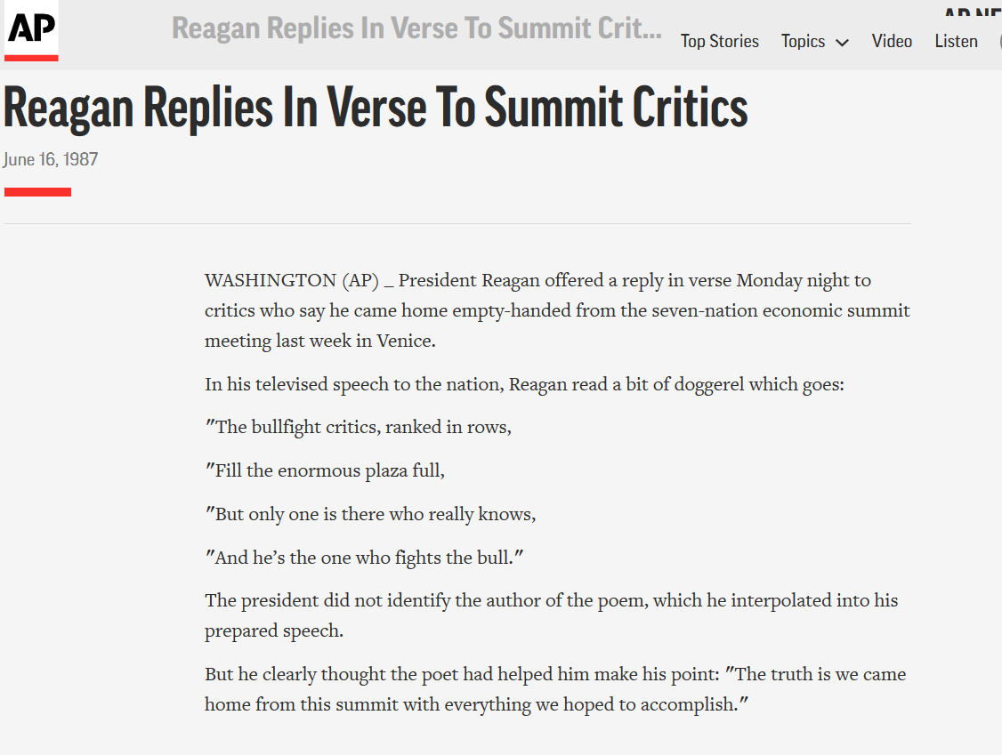 Sorpresa que pilla por sorpresa, Ronald Reagan responde a los periodistas con una frase sacada literamente del mundo del toreo ¡olé, arte!