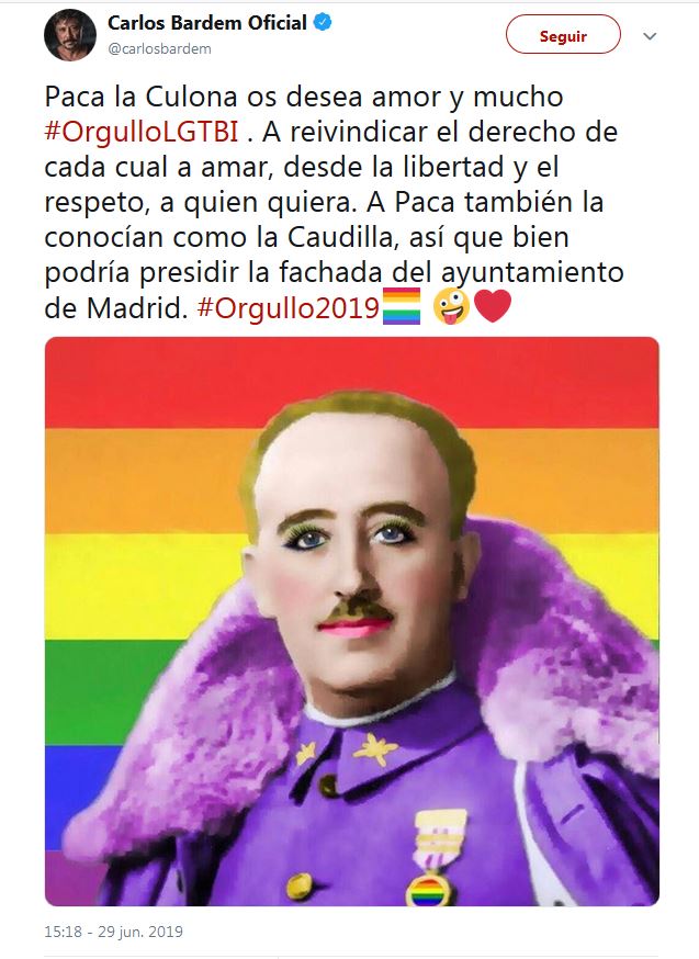 En este mismo tuit, las expresiones que usa este Bardem "Paca la culona" o "Paca" o "La Caudilla" son expresiones despreciativas y vejatorias hacia el colectivo homosexual, y cualquier miembro lgtb.