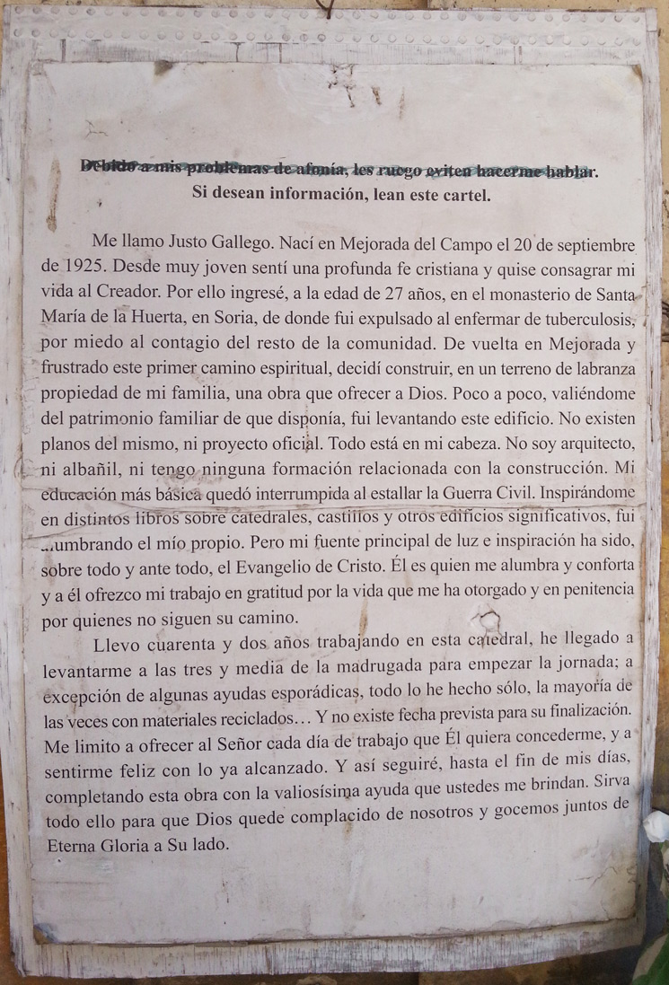 Justo Gallego ha salido en periódicos, radios, televisiones, documentales... de casi todo el mundo. No es ningún famoso. Justo Gallego es albañil. Desde hace 50 años construye una catedral. Él solo. De la mañana a la noche. A veces le ayuda alguien. La obra es colosal, es digna de una visita. Está en Mejorada del Campo, un pueblo a 20 km. de la gran ciudad, Madrid.