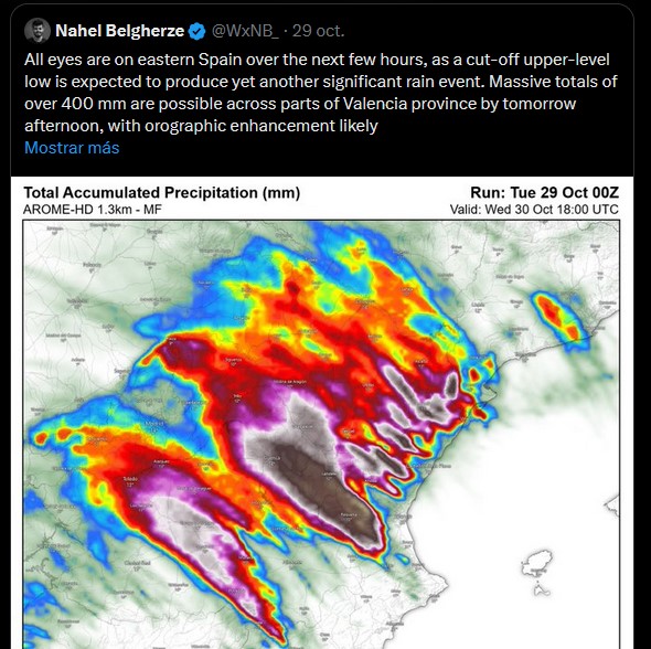 Todos los ojos estarán puestos en el este de España durante las próximas horas, ya que se espera que un mínimo de nivel superior produzca otro evento de lluvia significativo. Es posible que mañana por la tarde se produzcan totales masivos de más de 400 mm en partes de la provincia de Valencia, y es probable que la mejora orográfica desempeñe un papel importante en este evento. Las inundaciones repentinas que amenazan la vida son una preocupación importante.
