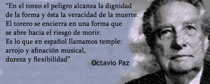 Como poeta y escritor su obra está considerada como una de las cumbres del idioma español. Aquí tenéis de un rápido vistazo parte de la obra de Octavio Paz y en la fotografía, una de sus frases que resume/explica el mundo de la tauromaquia a quien quiera entender el arte del toreo.