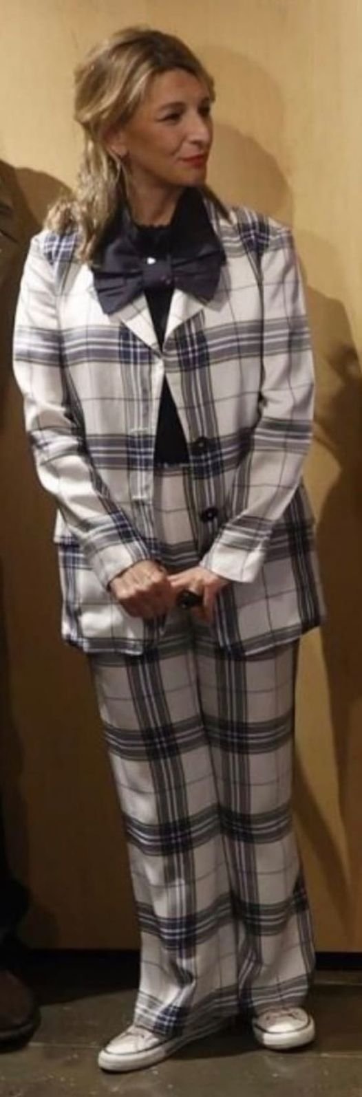 Después de debutar en público con sus compañeras de ideología, Yolanda Díaz toma la alternativa y para ello lleva un vestimenta absolutamente llamativa: presentan su biografía y asiste ella misma.