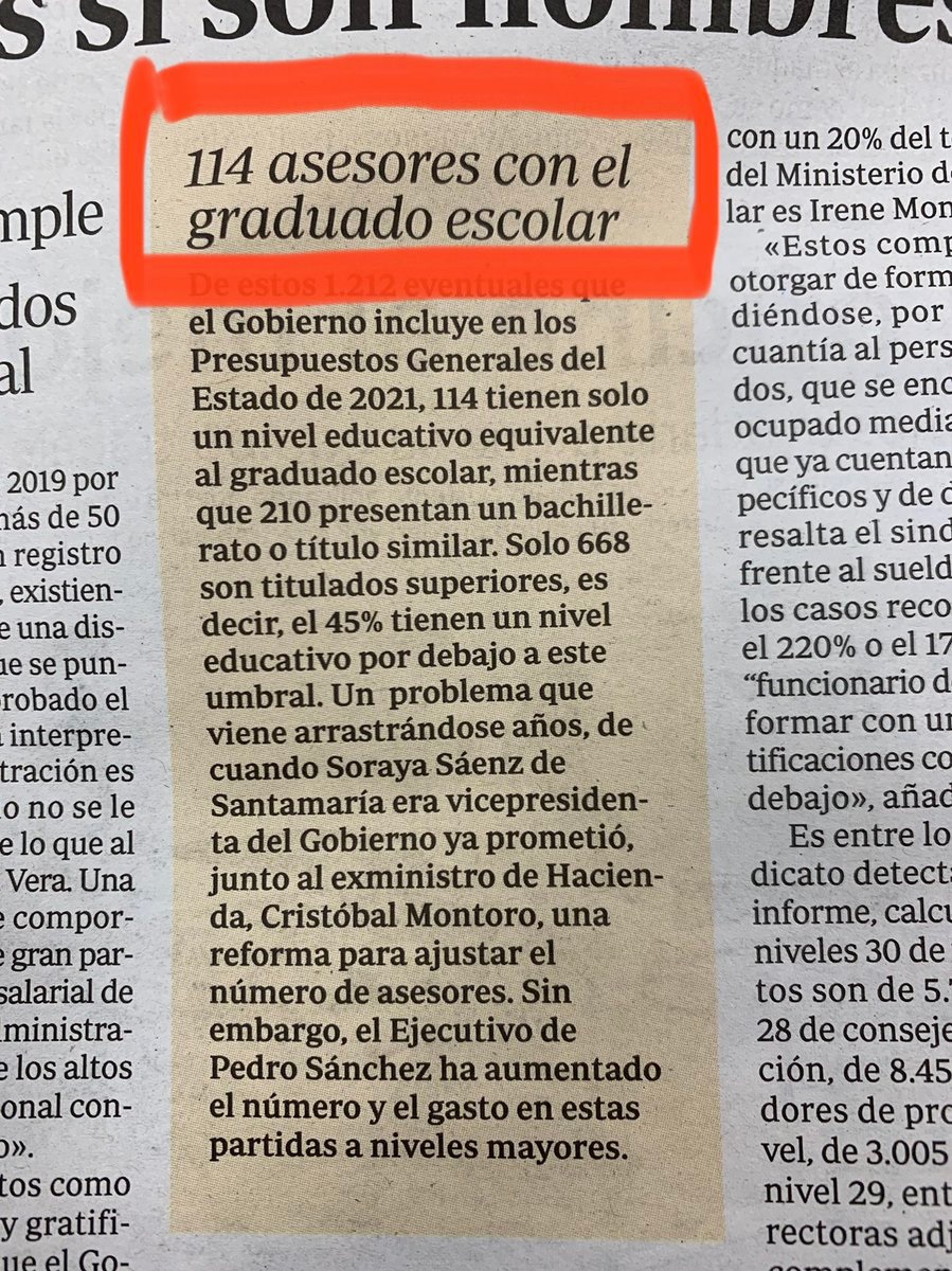 114 de los asesores de Sanchez no tienen ningún tipo de formación ¿cuál es su trabajo? ¿en qué materia asesoran? ¿pandemias? ¿hospitales? ¿vacunas? ¿economía? Lo he visto y me ha dado un patatús.