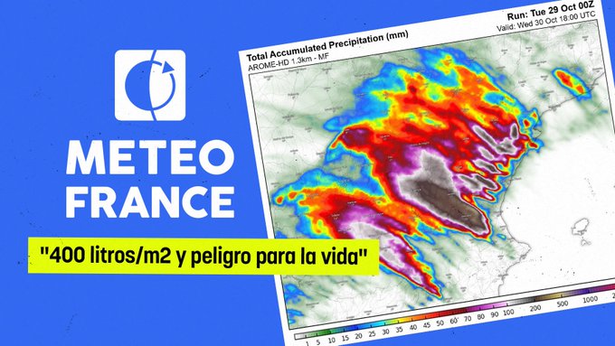 Madrugada del martes 29 de octubre: «Precipitaciones de 400 litros por metro cuadrado e inundaciones relámpago que podrían poner en peligro la vida». Finalmente, fueron unos 445 litros por metro cuadrado, muy cerca del aviso francés y bastante más lejos de los 150-180 litros que pronosticó la Aemet unas horas antes de la descarga mortal sobre Valencia en el "punto álgido del episodio".