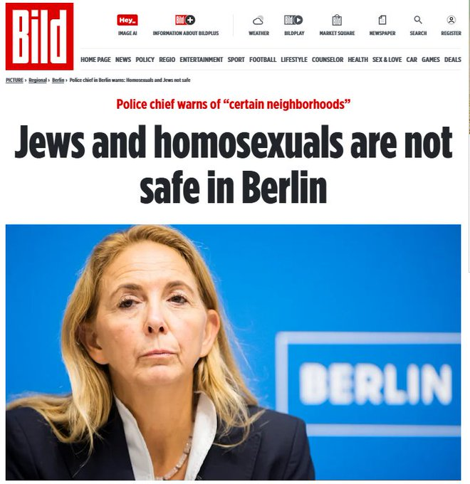 Esto de Alemania, Berlín: La jefa de policía de Berlín, Barbara Slowik, recomendó a judíos y personas homosexuales tener cuidado en algunos barrios de la ciudad donde vive mucha gente de origen árabe. Según explicó, en estas zonas hay personas que apoyan grupos terroristas y suelen mostrarse hostiles hacia los judíos. Por eso, sugirió evitar llevar kipá o mostrar abiertamente su orientación sexual en esos lugares.