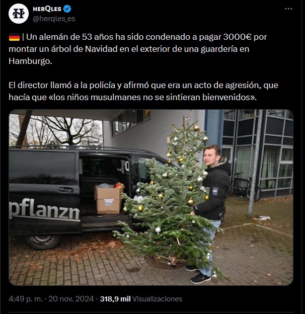 Alemania va muy avanzada, y puede superar a Francia: Un alemán de 53 años ha sido condenado a pagar 3000€ por montar un árbol de Navidad en el exterior de una guardería en Hamburgo.