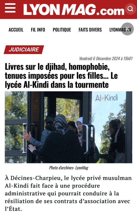 En Lyon, en un liceo privado, de nombre musulmán, y orientación también religiosa musulmana, pero estos son los temas. El liceo Al-Kindi aplica principios islámicos como la imposición del velo, la separación de los sexos y enseñanzas que contradicen los valores de laicidad e igualdad. ¿Es aceptable esto incluso en la enseñanza de pago? La respuesta es No. Pero en Francia "se la pela" les da igual.