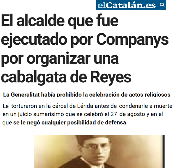 Hoy hace 89 años el alcalde de Lérida fue torturado y finalmente fusilado por haber celebrado la Cabalgata de Reyes Magos, incumpliendo las estrictas órdenes impuestas por Companys (ERC). Companys es ese tipo al que le dedican calles, plazas y estadios olímpicos.