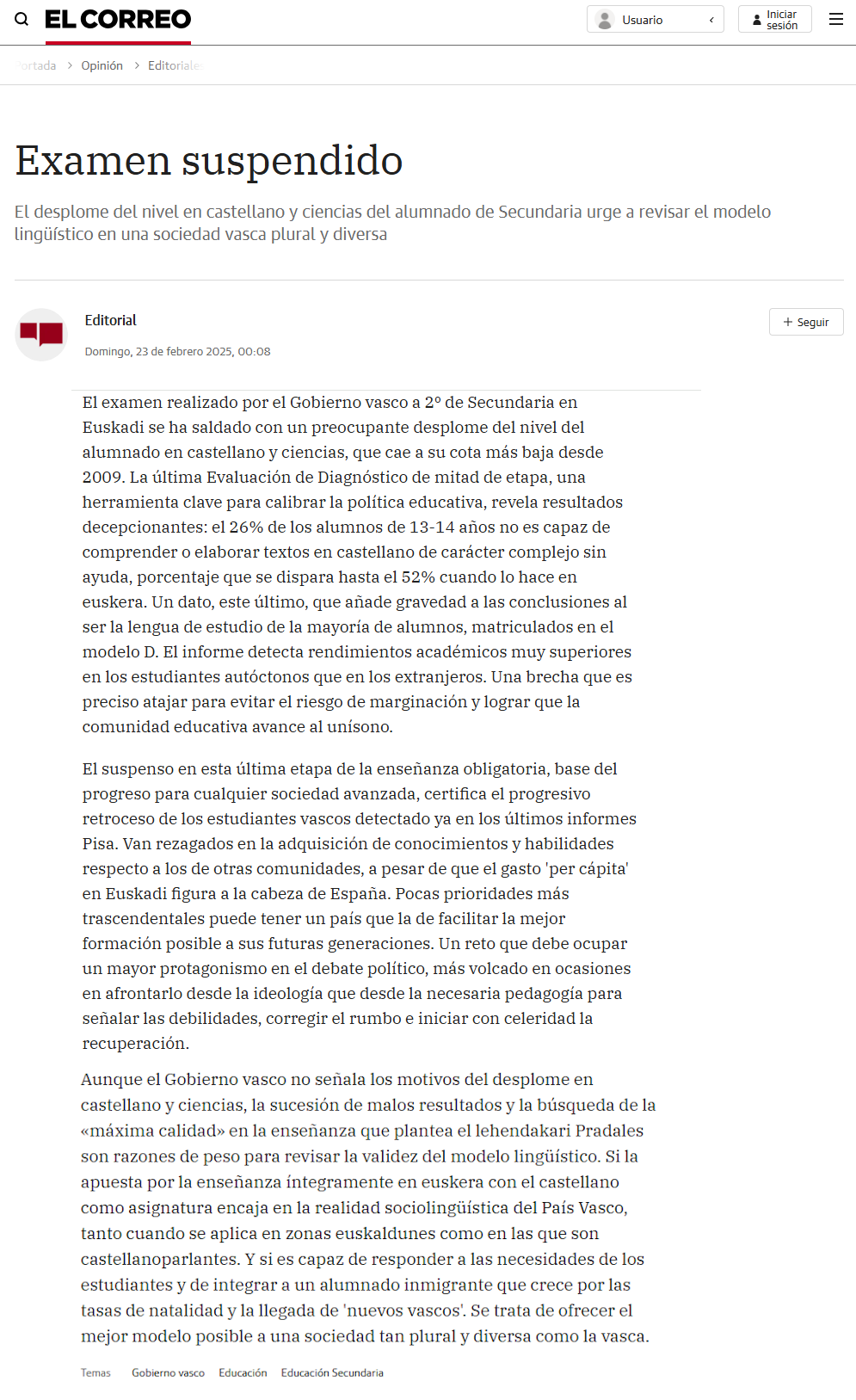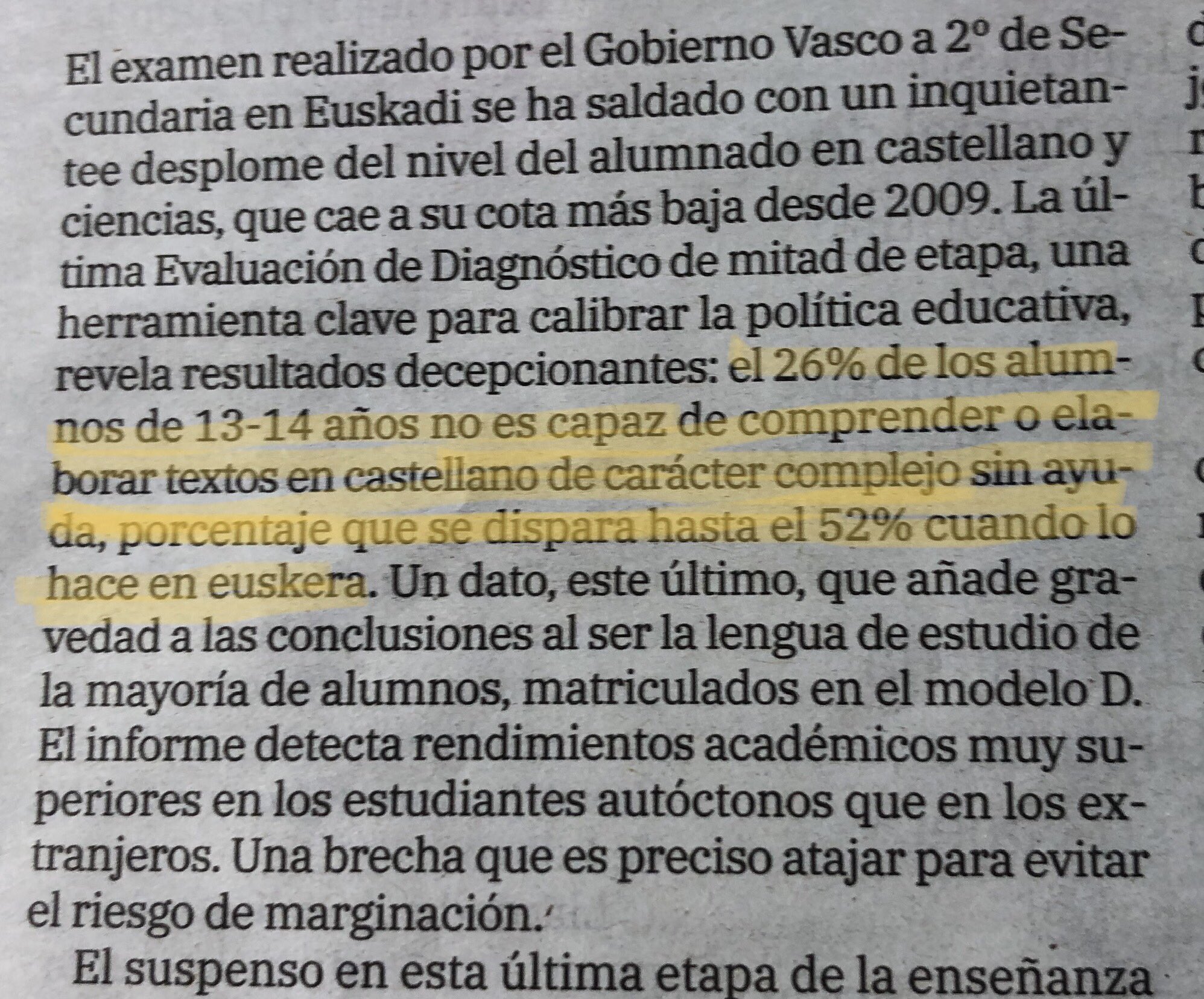 Los resultados académicos correspondientes a alumnos y alumnas de 13 y 14 años han caído a mínimos. Uno de cada cuatro no es capaz de entender ni de escribir textos complejos en castellano. Más de la mitad tampoco es capaz de comprender textos en euskera.