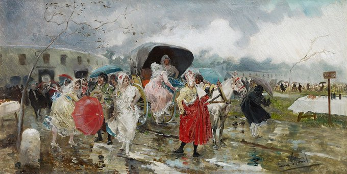 En ese sentido, su pareja de tablas de 1885 es casi un manifiesto. Entrada a los toros, sol y Salida de los toros, lluvia (c. 1885), conservadas en la colección vinculada al Museo Carmen Thyssen Málaga, proponen dos atmósferas opuestas y complementarias: el esplendor luminoso del día de toros y el desmontaje húmedo, atropellado, posterior al festejo. Son pequeñas por tamaño, pero grandes como relato: en ellas la plaza es un imán social, y la escena se entiende como una coreografía de gentes y circunstancias, donde el clima se convierte en personaje.