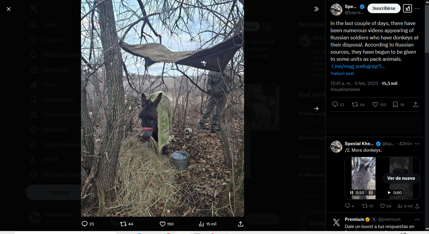 Las redes sociales reportan del envío de asnos, sí burros, pollinos, a los soldados rusos en el frente de Ucrania. La escasez de vehículos de transporte obliga a recurrir a los pollinos. En las últimas semanas, redes de telegram que informan de la situación en el frente han puesto el grito en el cielo por la falta de medios de transporte de tropas y material, de cualquier medio de transporte, no ponían el grito en el cielo por falta de vehículos blindados de transporte de tropas. No, por falta de cualquie vehículo, y han enviado jumentos, rucios, onagros...