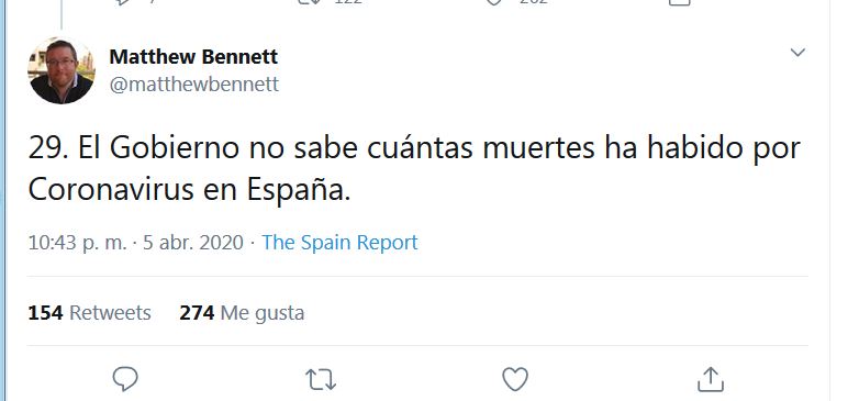 Copio y pego unos inquietantes tuits sobre el grado de conocimiento del gobierno de una cifra fundamental para luchar contra el coronavirus: el número de fallecidos. Matthew Bennet concluye que el gobierno no maneja datos exactos sobre el número de muertos. Y si no maneja datos exactos ¿es válida la estrategia del gobierno de Sánchez contra el virus?