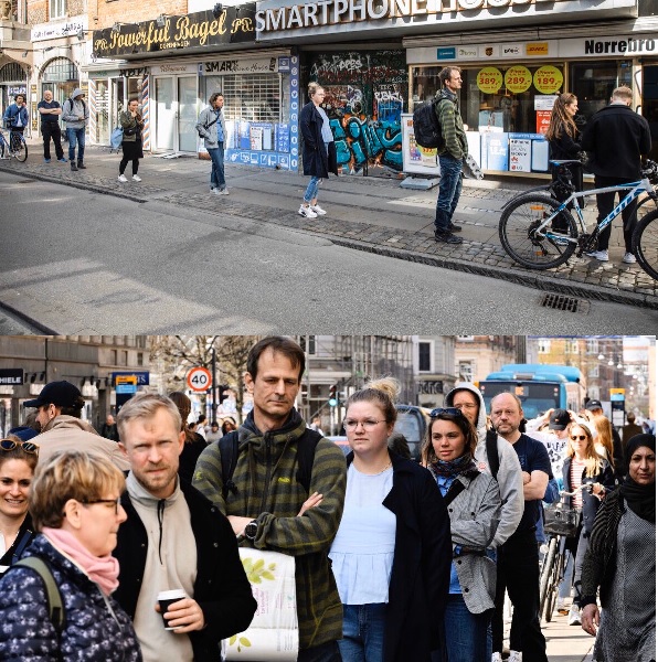 Estas dos fotos están sacada de tuiter y son de Dinamarca, es la misma foto pero con distinto objetivo, según explican. Con uma de estas fotografías se puede acusar a los ciudadanos de saltarse no solo la cuarentena y los confinamientos, también de actuar de manera totalmente irresponsable en la calle.