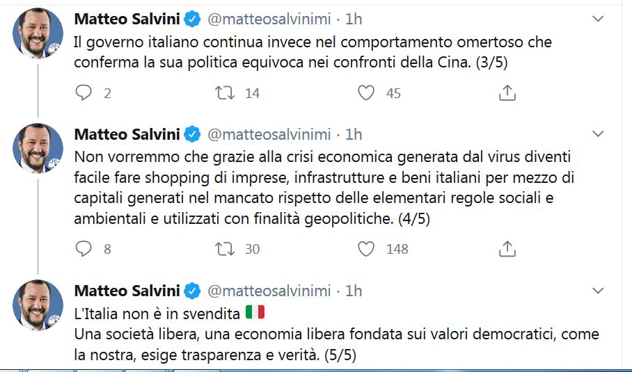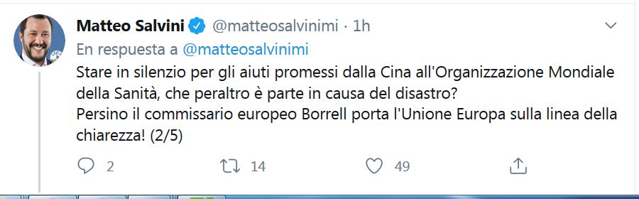 https://twitter.com/matteosalvinimi/sta ... 6218106882 ¿Guardar silencio sobre la ayuda prometida por China a la Organización Mundial de la Salud, que también es parte del desastre?