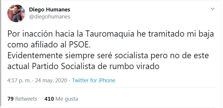 Por inacción hacia la Tauromaquia he tramitado mi baja como afiliado al PSOE.