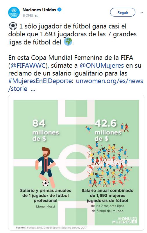 La Organización de las Naciones Unidas ha lanzado una campaña para que las mujeres futbolistas cobren igual que los hombres. La ONU exige un salario igualitario para mujeres y compara el salario de Lionel Messi con el de 1693 mujeres futbolistas para concluir que Messi gana el doble que las 1693 mujeres futbolistas mejor pagadas.