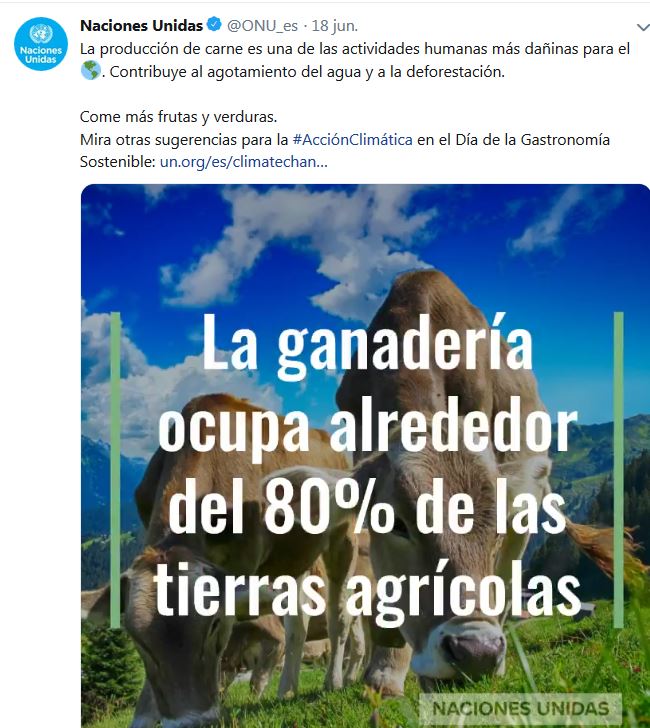 En los útlimos tiempos la ONU ha lanzado una campaña contra el consumo de carne como fuente de alimentación para la humanidad. La excusa que plantea la organización internacional, es que las vacas, cerdos, pollos, y otros animales que proveen el principal sustento para la humanidad son -los animales- grandes consumidores de forraje cuya producción tiene importantes repercusiones en el medio ambiente.