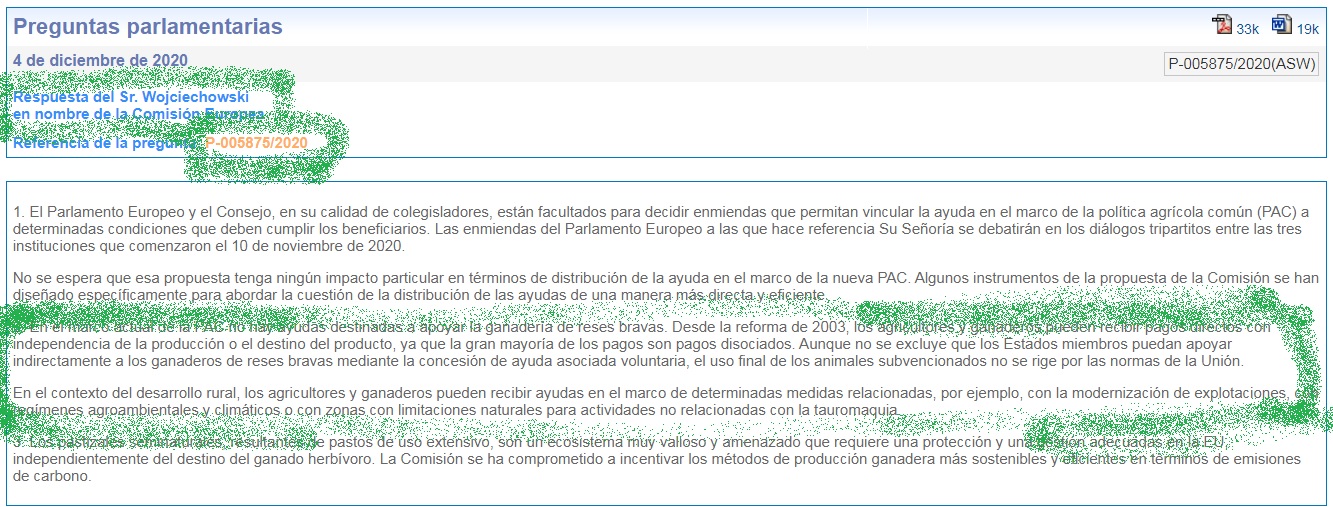 Desde el entorno de Mazaly Aguilar, diputada por VOX y vicepresidenta tercera de la comisión de Agricultura del Parlamento Europeo nos hacen llegar la respuesta a la pregunta de Mazaly Aguilar "“2. En el marco actual de la PAC no hay ayudas destinadas a apoyar la ganadería de reses bravas. Desde la reforma de 2003, los agricultores y ganaderos pueden recibir pagos directos con independencia de la producción o el destino del producto, ya que la gran mayoría de los pagos son pagos disociados. Aunque no se excluye que los Estados miembros puedan apoyar indirectamente a los ganaderos de reses bravas mediante la concesión de ayuda asociada voluntaria, el uso final de los animales subvencionados no se rige por las normas de la Unión."