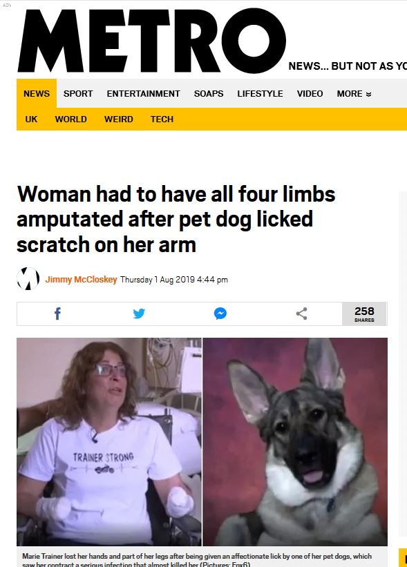 Este es el caso de la dueña de un perro que un día se despertó tras diez días en estado de coma y se encontró con que los médicos debieron extirpar sus antebrazos y pies afectados por una enfermedad transmitida por un virus situado en la boca de perros y gatos -a los que protege- pero que se trasmite a los humanos causando infecciones que solo se curan mediante extirpación de zonas afectadas.