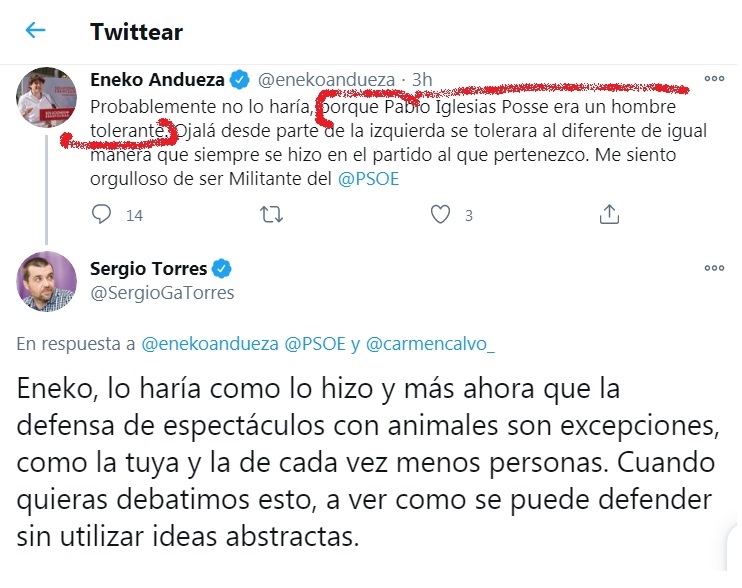 Sergio Torres @SergioGaTorres y Eneko Andueza @enekoandueza han tenido un intercambio en tuiter; una cosa así, suave, de "colegueo" como pedo de monja, un yo te digo, y tú me dices, y quedamos para debatir; ambos pensando (quizá) que ellos son desconocidos y así juntos, apoyados en tuiter, pueden ganar algunos seguidores o algún like.